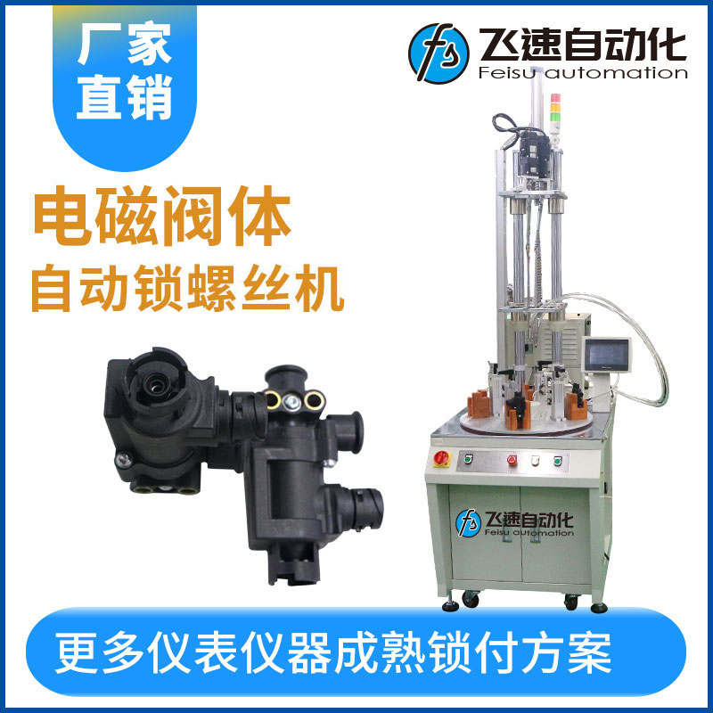 電池閥是用以電磁控制的工業(yè)設(shè)備,是用來控制流體的自動化基礎(chǔ)元件,目前電池閥有很多種,本案例主要講解電磁閥閥體的裝配技術(shù),用于電磁閥閥體的壓鑄系統(tǒng)包括有一儲能器座和一閥體本體。 電磁閥閥體在生產(chǎn)中需要有精密的質(zhì)量控制,在裝配中需要螺絲緊固,采用手工業(yè)作來尋找螺絲孔對準在鎖付,由于無法看清螺絲孔的內(nèi)部,人工在作業(yè)時容易導(dǎo)致把產(chǎn)品擰壞或者滑牙等問題導(dǎo)致工作效率低生產(chǎn)標準品質(zhì)低,為解決這些生產(chǎn)問題,廠家通常都會采用機器人或者電動螺絲刀來實現(xiàn)高度柔性自動化生產(chǎn),飛速自動化在這里為廠家設(shè)計了一臺轉(zhuǎn)臺式多軸自動鎖螺絲機,該設(shè)備特點如下: 設(shè)備通過氣動元器件實現(xiàn)螺絲的自動輸送、擰緊、檢測等工序同步進行,通過設(shè)備來簡化螺絲緊固工序。可實現(xiàn)對多個工件進行四個面以上、任意角度的三維空間加工處理,使每條流水線一天工作八小時生產(chǎn)的產(chǎn)品可達到3200個以上,每條流水線可節(jié)約四名以上的工人,大大提升產(chǎn)能的同時,降低了工人的勞動強度;其采用柔性化設(shè)計,并適合對多個不同品種、不同型號的加工工件進行自動打螺絲,且換品種調(diào)試時間< I分鐘,節(jié)省時間,成本低,效率高,其又通過設(shè)置有翻轉(zhuǎn)機構(gòu)可全自動智能化地對加工工件進行橫向或縱向翻轉(zhuǎn),避免了人工對工件進行翻轉(zhuǎn),并設(shè)置有定位機構(gòu)和限位機構(gòu),對工件傳送進行定位和限位,加工定位精準,成品率高,效果好,智能化程度高,適合工業(yè)自動化發(fā)展的需求,結(jié)構(gòu)簡單,使用簡單、快捷,便于廣泛推廣使用的多軸多工位獨立自動鎖螺絲機確屬必要。