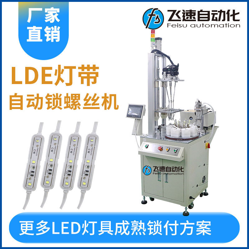 led燈帶是指把LED組裝在帶狀的柔性線路板或PCB硬板上,產品形狀象一條帶子又非常節能和綠色環保,用于各個行業中的裝飾,LED燈帶的使用也越來越普及,也因為使用壽命長(一般正常壽命在8~10萬小時),所以在市場上需求也比較大。 LED燈帶是采用FPC做組裝線路板,生產組裝過程中都需要對燈具貼片和各個工件進行螺絲緊鎖加工,在傳統的生產線上,技術工人需要對不同型號的燈具體分別進行螺絲鎖緊加工操作,雖然也應用了自動機器人之類的自動設備,但是傳統生產線的自動化水平還比較低,不能適用于不同型號的燈具加工,設備的自動化水平還需提高。 本案例應用于LED燈帶自動化生產線的自動鎖螺絲機,主要目的在于解決生產中的不足和缺點,設計一臺自動化燈具生產螺絲設備,它不僅可以對燈具進行自動化地組裝、鎖緊加工操作,而且可以適用于不同型號、規格、大小的燈具體,設備的自動化水平比較高。 該設備根據產品進行設計多工位轉盤式螺絲機,通過在轉盤式安放多個工位實現多工序同步作業,主要是為了實現擰螺絲和取放產品同步完成,作業員不停放置產品,設備不停擰螺絲,增強了人機協作,較大幅度提升效率,減輕人工勞動強度。
